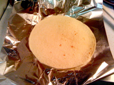 In the meantime, get a piece of foil and put a tortilla on top. You don’t have to do this, but it’s a nice way to eat it if you’re on the run. Plus the the heat from the guts “steams” the tortilla.