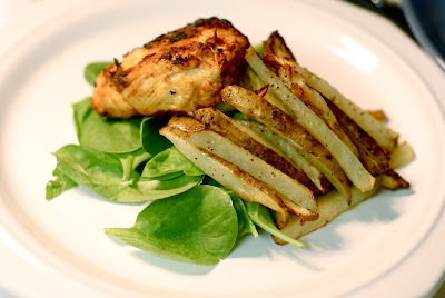 Feel free to use sweet potatoes here if you want. Go ahead and cut up a potato, steak fry style.Toss it in salt, pepper and extra virgin olive oil. Spread out on a pan and cook in a preheated oven at about 450* or so.