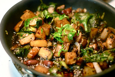 After the brussels get a little color on them, add a handful of chopped onion. If you prefer your onions to be a bit more caramelized, add them when you put the potatoes in.