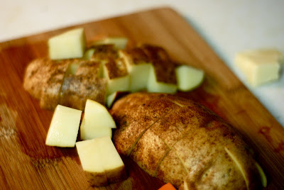 Use whatever veggies you’ve got on hand for this kind of meal. I’ll show you which ones I personally used though. Cut a potato in half.