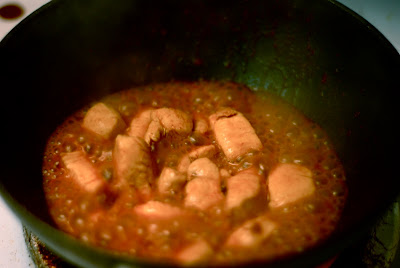 In a very hot, greased pan, add about 1/2 cut up chicken breast and a pinch of salt.